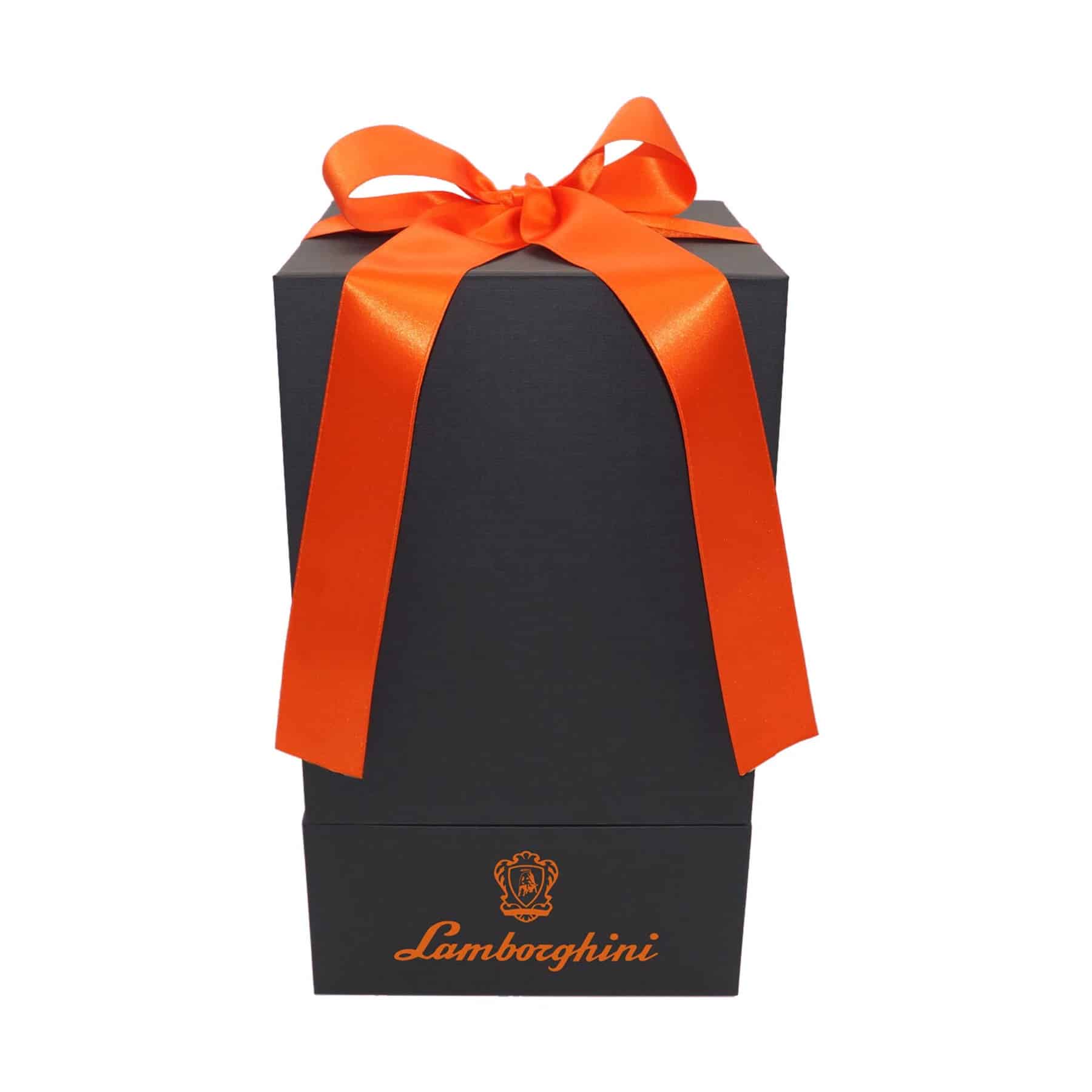 Black case with orange ribbon containing the PALATINUM Lamborghini red wines selection